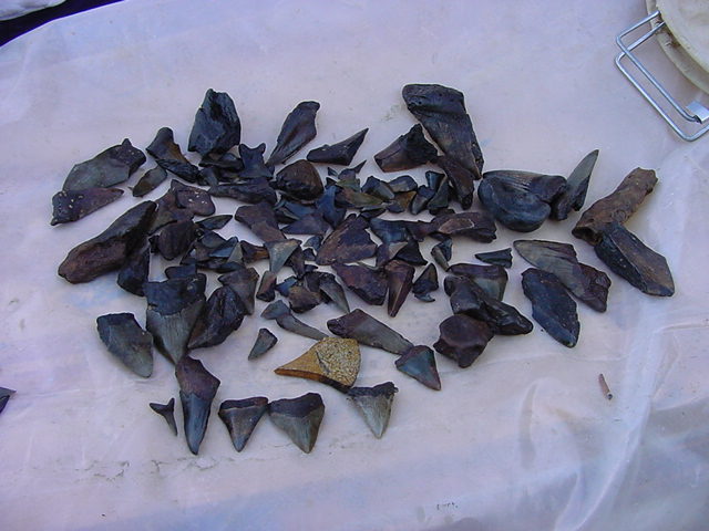 Probably the last day diving this year - good thing it was a bag filler!!Today, my dad and I went diving in the upper Cooper. Vis has never been better. We were in over 30 feet of water and we could still see light from the surface! In fact - we didn't even need a light. I think it was because of a variety of factors. It has been unseasonably cold here lately, and the water temperature has dipped down pretty low. Cold water means better vis. Plus, there has been very little rain. Result - I hauled in the teeth. There are two pictures below - one of the few good teeth I found, and one of the total mass of teeth. The Mako at upper left is incredible!