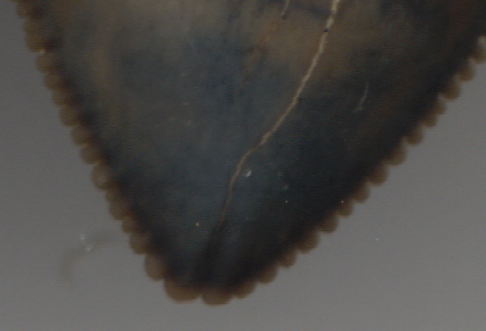 Took the finds home and the tale of the tape had the tooth come in at 3& 1/16 and BONUS - the tip has two serrations, not one and a little bigger than normal gap between the two tip serrations. I’m not sure if it truly is a double tipped meg so I’ll let the BRFC brethren weigh in on that. Either way, sweet tooth and you can now barely see were the barnacles had been. The colors got even better as it dried. You can even see that the first 1/2 inch or so of the tip has been bleached so the tooth must have been sticking out of the cliff tip first for some and the sun dried it out before it spent some considerable time in the water for the barnacles to form.