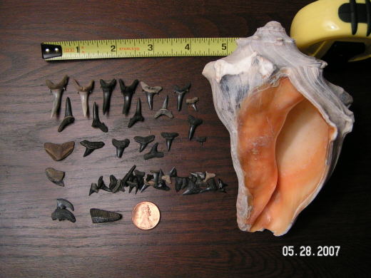 I was told that Hilton Head was a relativly new island (geologically speaking!), but I still wanted to take a look in the mornings for teeth. I managed to get out out twice, and you can see that the teeth were hard to come by. I did manage a couple of nice sand tiger teeth and also found my first whole conch shell. It was fun and worthwhile, but definitly not like the bay at home.