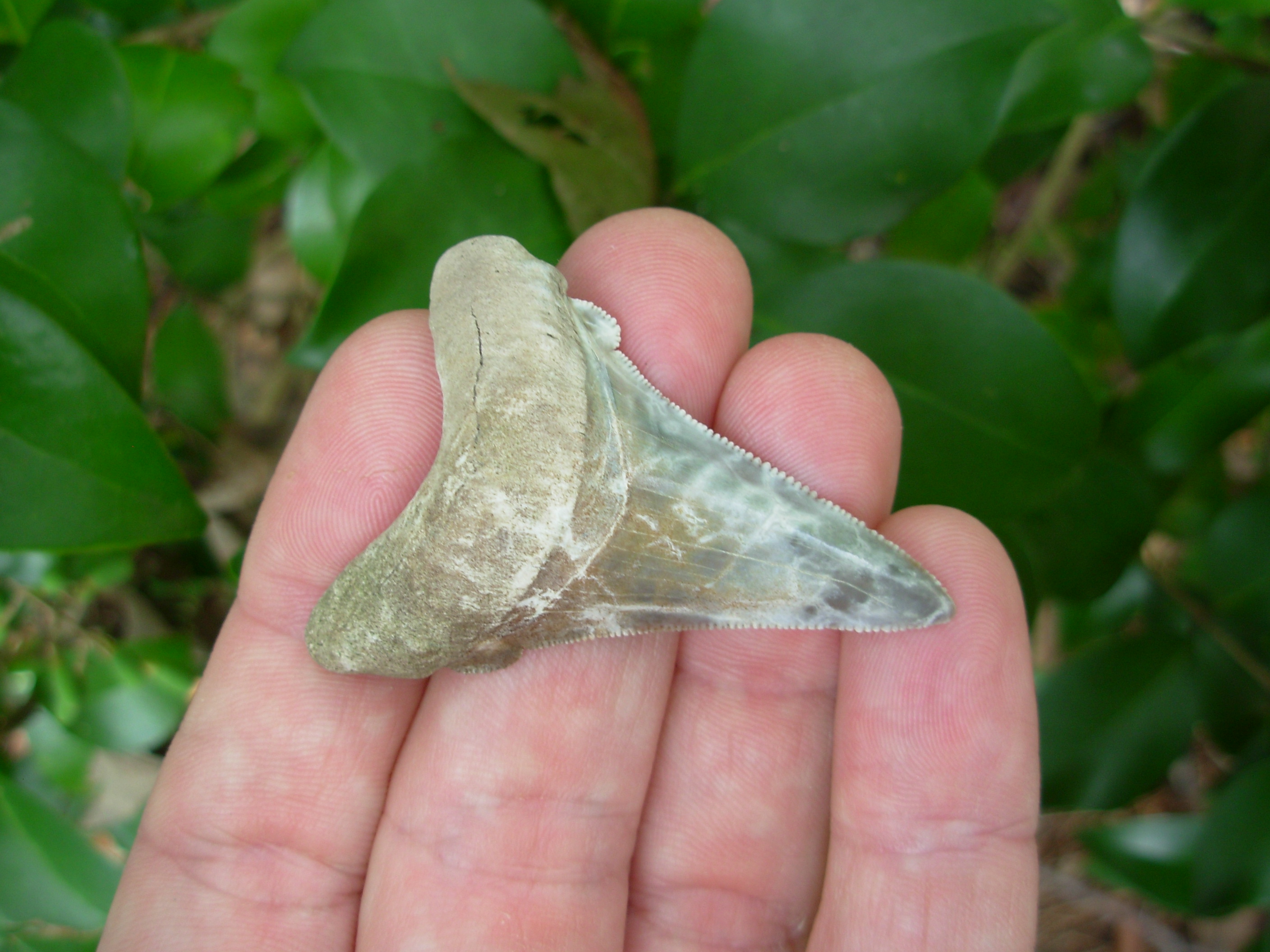 Another good rain....Thunderstorms rolled through last night so I headed out in a quest for fossils. I arrived wondering what could just be waiting for me...I grabbed my backpack and started walking and scanning...nothing but broken pieces and teeth barely visible to the naked eye ! I was thinking surely the rain must have washed something good out... then I spotted a bourlette pattern and root lobe...I immediately tugged gently on it and a 2 inch+ Angy "appeared" in my hand. Sorry no ground shot this time...forgot my camera. My hunt continued on, but the recent rains although washing some teeth out seemed to cover a lot of the creek with sand and unfortunately a lot of the fossil material as well. I did manage to find a few more smaller teeth, but the Angy was best find of the hunt, but it certainly made my day !