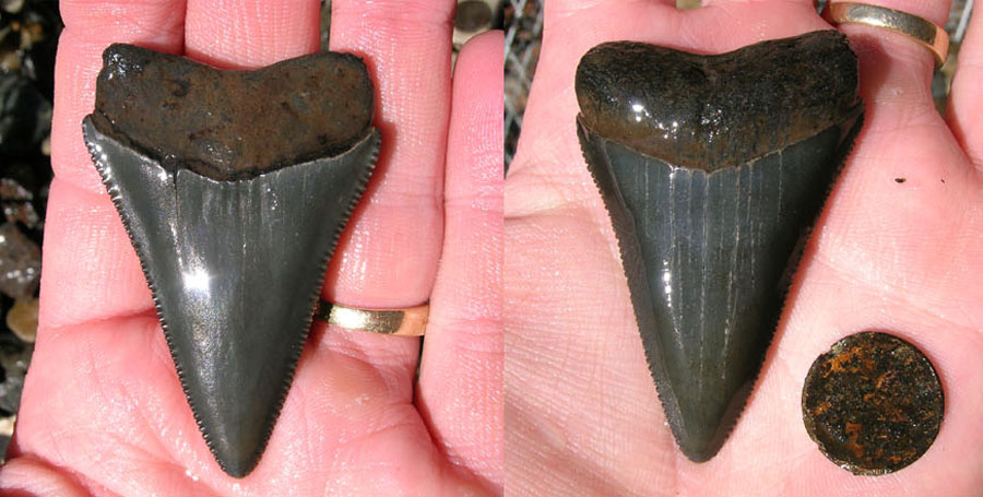 Like with my “toad”, I brought my precious haul to the sunny creek bank, grabbed the camera and took a deep breath. I scanned the basket to locate what I think I saw. And there it was, lurking in the shadows, the serrations. I carefully removed the surrounding gravel to exhume my find. My jaw locked and almost soiled my waders. My eyes were not playing tricks on me (as knees buckled and knelt in the creek). I just found my second biggest tooth and my largest Great White (Carcharodon carcharias), exactly 2½”. It was in perfect condition and luckily had no shovel scratches.
