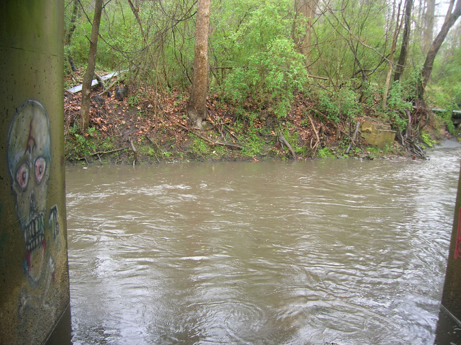 The water was churning as I carefully made my way down stream where I was the last time screening. I put my probe on the side of the bank to keep an eye on the water level. In about 15 minutes the creek went up a good 6 inches. Knowing from past experience not to fool around with GMR at “high tide”, I didn’t want to trip and end up floating down to the Tar River. The water was coming up fast and the stumps I took note while walking down stream were no longer visible. As a result, I made my way back to the 10th Street Bridge doing the geriatric shuffle (rumor has it that 3 BRF members took a drink in the Run with one lucky member an additional dip on Sunday – your secret is safe with me…lol).
