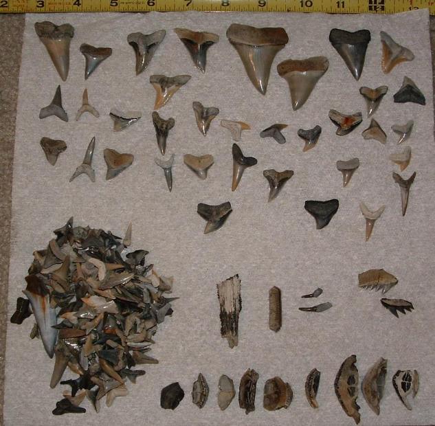 A Day In The Trenches at AuroraWell, it was time once again for the semi-annual PCS fossil hunt at Aurora NC. DW headed up to Columbia so that I could work late on Friday to keep the man happy. As I made my final preparations, DW scoped out the newly modeled fossil room in my loft. After about 10 minutes, I was ready to go and DW had placed his gaping jaw back into position. Of course, when I hunt in Summerville, I suffer the same paleo-jaw dropping every time I see DWs choice fossil collection. We arrived at the chateau-du-roach around 9:30 PM and I guess my fatherly instincts kicked in because I swiftly snuffed out two large roaches. We arrived at the mine about 7:30 in the morning, and met with gman and M4 to exchange pleasantries. Gman and myself decided to hunt together. What a cool cat, and this guy can score some teeth. The collecting area was a hodge-podge of Pungo, Yorktown and James City. I picked up a few teeth here and there. I did find two cow shark teeth, and one I repaired. I also bagged a decent mako (see ground shot). Gman found a killer hemi and traded out the tooth for the mako. This would prove to be good karma as two seconds later I spotted a killer Yorktown mako hanging from a ravine edge. We met up with DW later in the day and as usual he racked some choice teeth. BY 1 PM, the area had been worked and I was pretty much sandblasted by the 30+ mph winds. Nevertheless, a Bell feast was in order, and then more collecting. We decided to collect the road spoil piles. I found a few smaller teeth, nothing grand, but no daylight went unused on this collecting day.