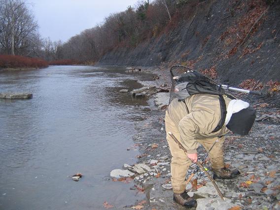 | During our NY portion of the trip, we fished the mighty Niagara River. I've caught many a lake trout over the years but very few this size. It was 32" long. But what makes it special is that it was my first one ever taken on a fly rod. Now that I have them figured out, there will be many more in the future I hope. I usually do some fossil hunting in this area, but I was too focused on the fishing and failed to collect any at this location. |