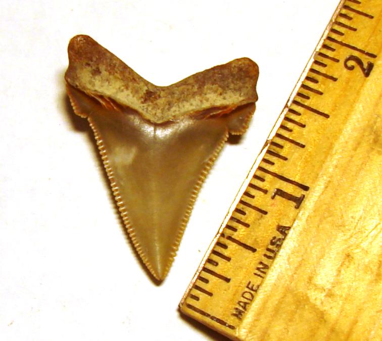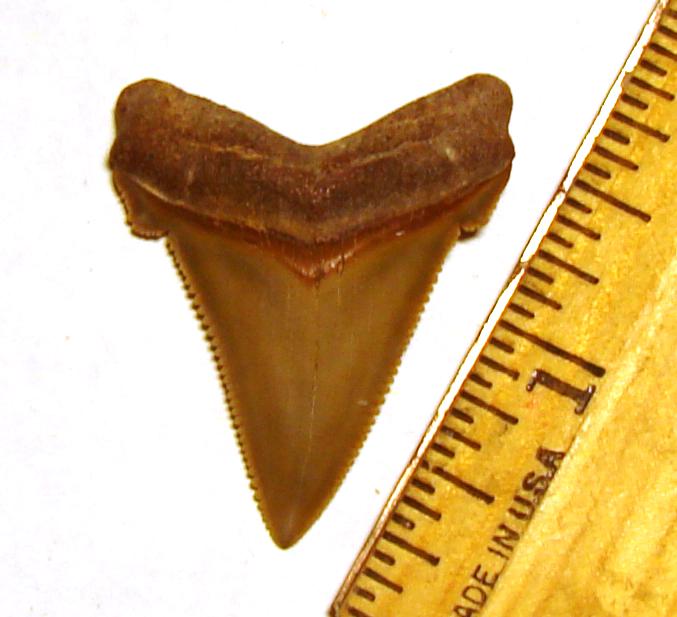 Angustidens Shark Tooth Here's a litte beauty of a tooth with pretty much every feature - serrations, tip, bourlette, root, and nice reddish-orange color. I wish I had my camera because it looked cool on the ground.