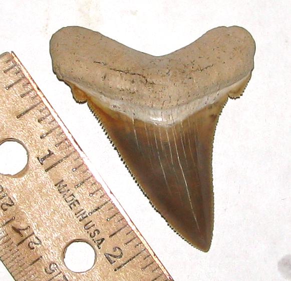 Carcharocles angustidens toothA really nice looking Carcharocles angustidens tooth from Summerville. I saw it and immediately pulled out my camera. I looked down for just a second to make sure I didn't drop it into the ditch and in that split second I lost the tooth. I stood motionless for 45 seconds looking for the prize. The weezling told me it was under a leaf, and he was right. What a coincidence that the fraction of a second I looked away was enough time for nature to hide this tooth again mere hours after exposing it!