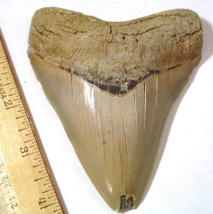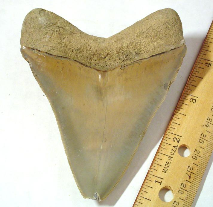 Megalodon Shark Tooth Near midday, da f0ssZ and I reached the middle of the mine where the greatest concentration of weeds are. We surmised that the plant life obscured the view of plainly exposed teeth, meaning that if you didn't walk right onto the tooth, you couldn't see it. Near a valley between two giant hills of Yorktown, a hundred yards from any water, I stumbled on a chunk of Holocene Coprolite, the size of which was incredible to behold. I would have guessed a bear left it there had there not been little wads of TP next to it. I had to call da f0ssZ over so he see it, lest he not believe the tale later on the ride home. When he was about 20 feet away I decided to survey the landscape around the York-turd. Then, a mere 12 inches away, I saw the blade of a megalodon plainly exposed. The tip was dinged, but I was elated. My first Yorktown megalodon! DF saw both the tooth and the other "find", and while he was standing there with a big grin, he spotted the edge of another megalodon about 5 feet away from my meg! Closer inspection of the formation revealed the greatest concentration of bone I had ever seen in the Yorktown. I took a second to watch DF unearth yet another complete megalodon tooth. As I surveyed the pile of bone, I spotted a killer Mako (posted separately) completely exposed, nestled under some weeds. As a result of our finds, df and I excavated the whole area of bone just in case any other nice stuff was buried nearby. There was nothing else to be found there, but in the process of digging, I did my part and buried the mega-load that spurned both of our biggest finds of the day.