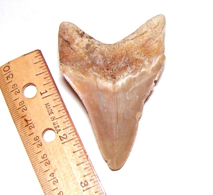 Megalodon Tooth This pretty little megalodon tooth was almost completely buried when I found it. Just half of the right root lobe was exposed as I spotted the flat side of the tooth. I wish I had my digital camera, but I learned my lesson earlier this year. I will never take my camera out in the rain again.