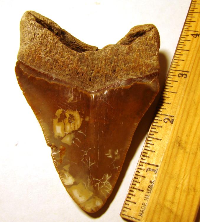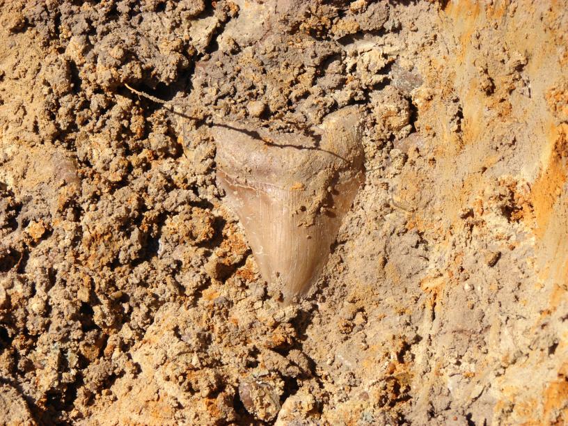 Megalodon Tooth A nice little Summerville megalodon with pretty colors. I'm glad I remembered to bring my camera so I could snap the ground photo!