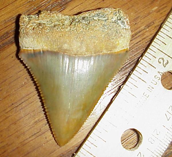 2 1/8" Great White Shark ToothAnother superb carcharias tooth from the Pliocene rich deposits at Superpit. A tiny chip out of the upper left corner of the root keeps this from being the best ever.