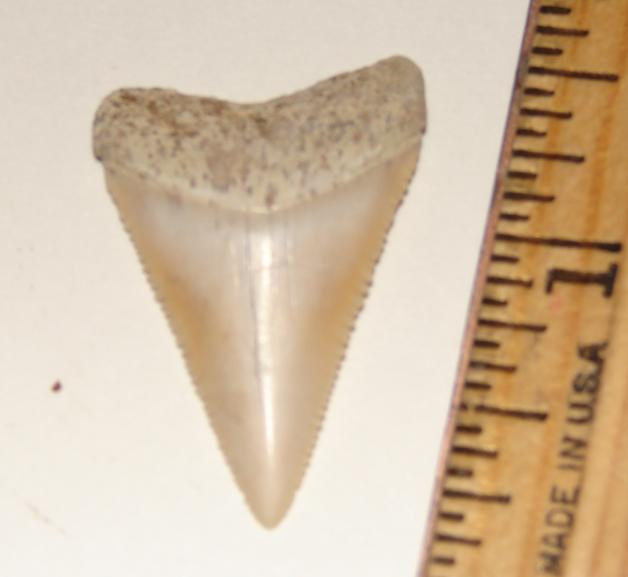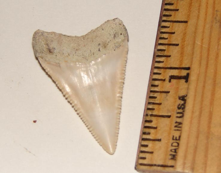 Fossil Great White Shark Tooth A nice, complete little white fossilized modern great white tooth. This is actually the first nice great white I found in the ditch by my house. It was the first of two on one day.