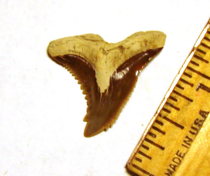 Fossil Hemi Tooth I love the color on this tooth. Its almost a reddish-purple color. Plus its got a cool variation on the blade. There is a little indentation on the edge of the blade that looks like feeding damage but magnifaction reveals there is no break, but the enamel is smooth and is just indented. On another species I would call this a pathology but I've seen it before on other hemis. Perhaps it has something to do with the way the teeth fit together in the jaw? There is another variation in some teeth in the same place on the tooth that produces a line of serrations on the labial side of the tooth.