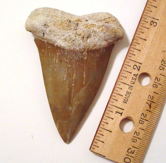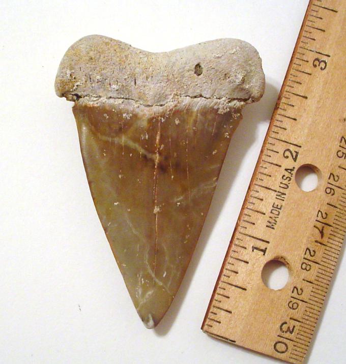 Fossil Mako Shark Tooth When I got this puppy home, the first thing I did was measure it. I tracked sand and mud all over the house in my impatience. It turned out to be 2 7/8 inches! Almost!!! How could I be disappointed with this tooth, though? Its massive, its complete, its got great color. Most of the makos we find in Summerville had severe root rot or no root at all. This is a centerpiece of the Isurus hastalis collection!