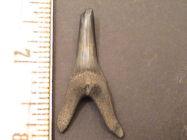1 3/4" Goblin Shark Tooth This goblin tooth is a couple of chips away from being one of the nicest I've ever found. Other than the tip it's perfect and the root has a little pathology to boot.