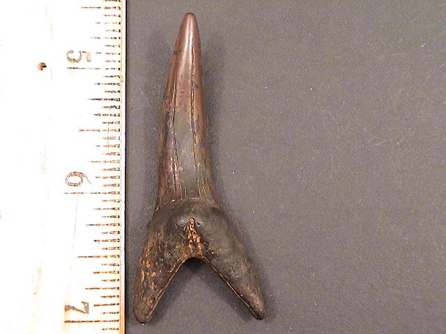 2.5" Eocene Sand Tiger Shark Tooth What this tooth lacks in asthetic beauty is more than compensated for in it's unbelievable size. I had found pieces of sand tiger teeth that I suspected would be in the 2 1/2" range whole, but I never thought I'd find a complete one. An awesome tooth!