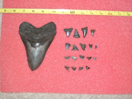 Megalodon Says it All!This one is to be remembered. Indeed. I had a chance to hunt with my serrated buddy DW et al at a land site in the Lowcountry, and of course to practice busting out some dope rhymes. We are fortunate enough to be able to sift the fossil bearing formations due to this sites proximity to ample flowing di-hydrogen monoxide. This site has produced pristine teeth, and also has a reformulated “lag” layer. Weezling has found a worn meg in this location on a previous trip, so we had a hunch that bigger meg teeth were possible. This day proved it. I was filling my sifter and noticed a larger piece of what I thought was phosphate (pronounced Fosszphate)…thought nothing of it and added more layer. As I started to rinse the sifter…the rock appeared like a root of a tooth…no way…one more shot of water and a massive meg popped out! This tooth is from the aforementioned reformulated layer, but had excellent preservation with bourlette and serrations. After the BRFC drool streams were shut off, back to sifting…DW bagged a sweet fish jaw, T$ a pristine cow (and tiger) and Weezling the first sand tiger from this location. Victory Moe’s followed, naturally!